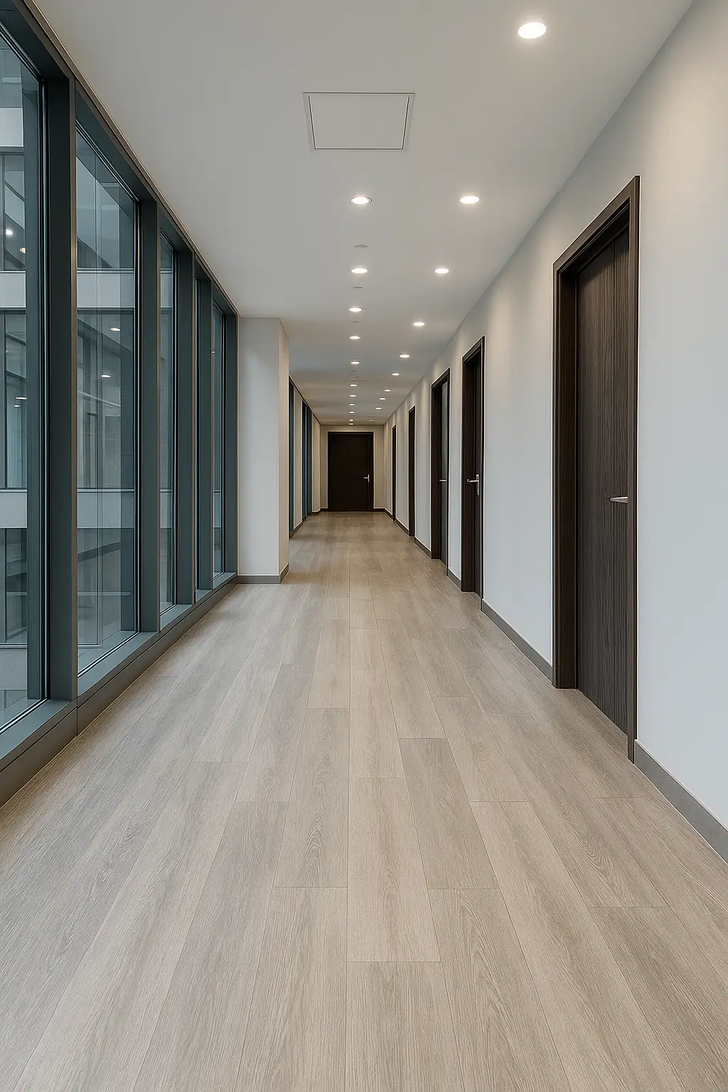 En el sector corporativo, este tipo de piso combina diseño moderno y confort acústico. Su estructura multicapa absorbe el ruido generado por el movimiento constante, mejorando el ambiente laboral. Además, su estética profesional se alinea fácilmente con la identidad visual de la empresa, proyectando una imagen más elegante y coherente.