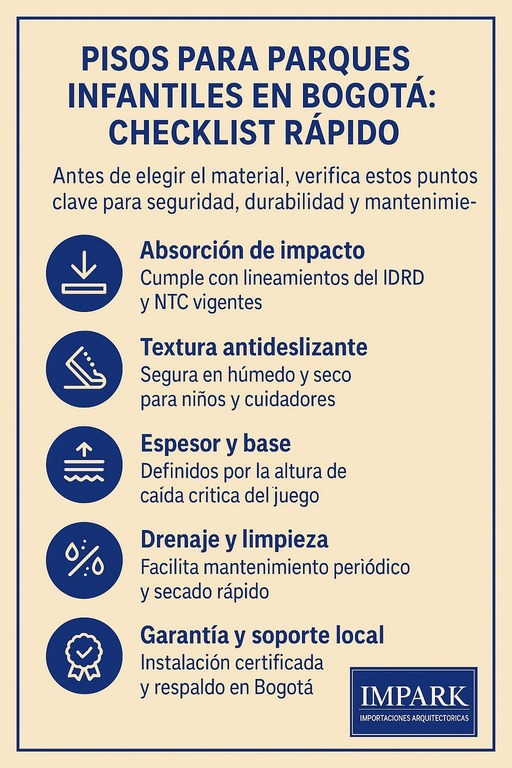 Si buscas una propuesta alineada a tu proyecto en Bogotá, agenda una visita técnica con Impark. Recibirás recomendaciones específicas, comparativas objetivas y un plan ejecutable para instalación y mantenimiento. Da el siguiente paso y cotiza tus Pisos para parques infantiles en Imparkcon la tranquilidad de trabajar con especialistas.