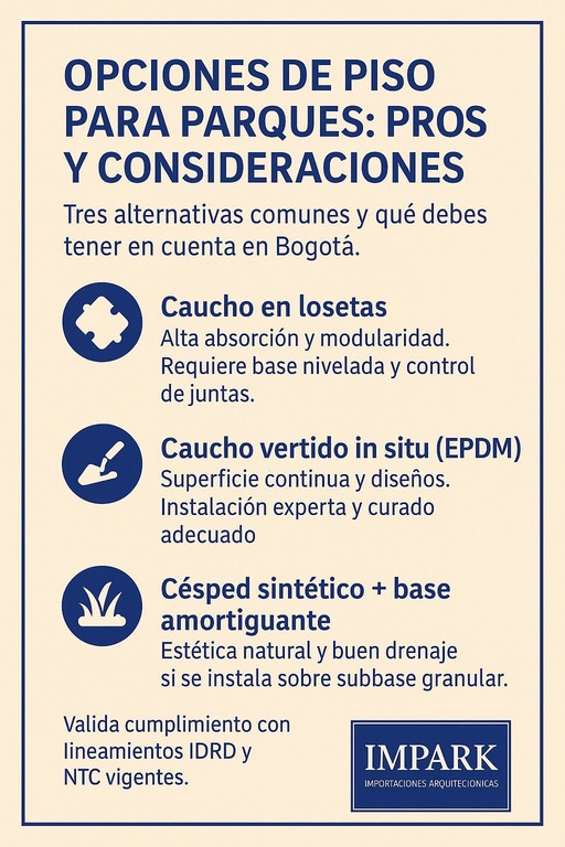 Antes de entrar en detalle, esta tabla resume fortalezas y puntos de atención para ayudarte a preseleccionar opciones de Pisos para parques infantiles según tu contexto en Bogotá.