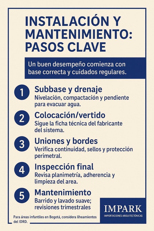 Una instalación bien planificada reduce retrabajos y cierres prolongados del parque. En Bogotá, calendario y clima mandan: coordina ventanas secas para aplicaciones húmedas (como EPDM) y asegúrate de proteger el área durante el curado completo. La preparación del sustrato es tanto o más importante que el acabado final.