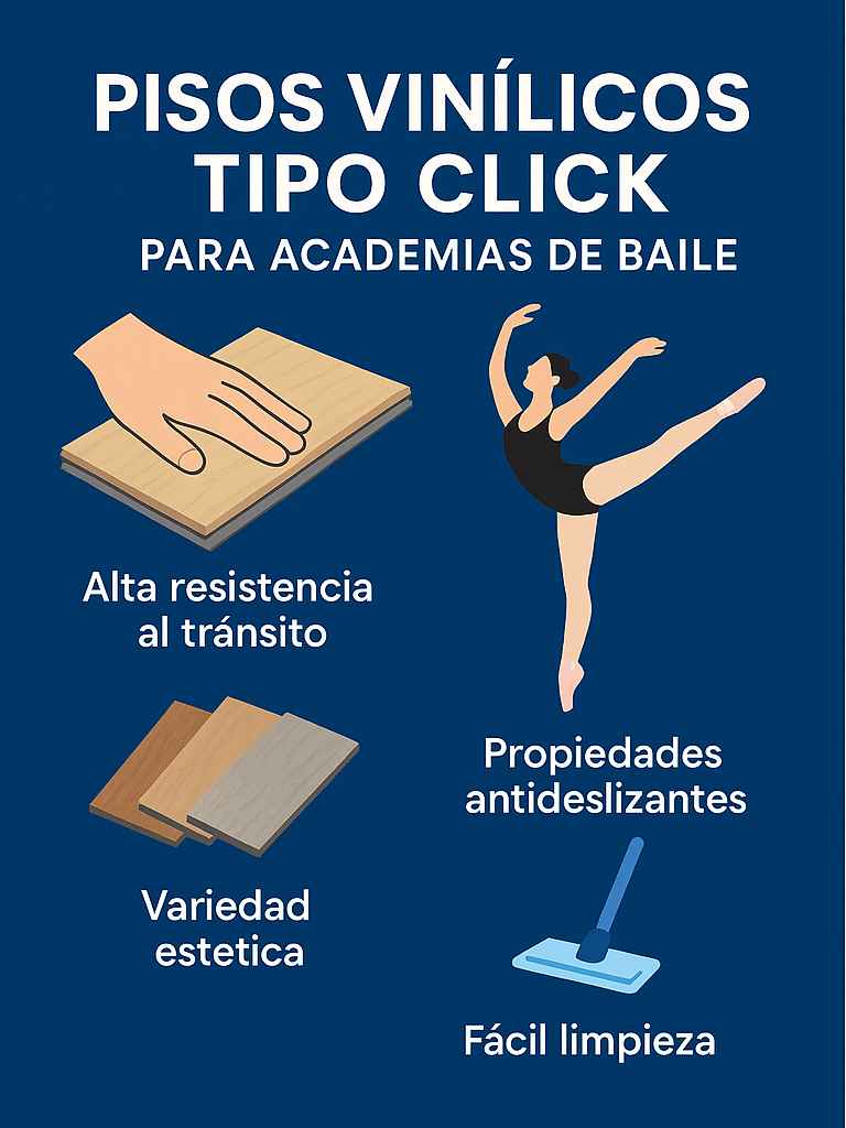 Los pisos vinílicos tipo click son especialmente recomendados para academias de danza, ya que combinan la practicidad de la instalación flotante con las propiedades técnicas del vinilo. Entre sus principales ventajas destacan: